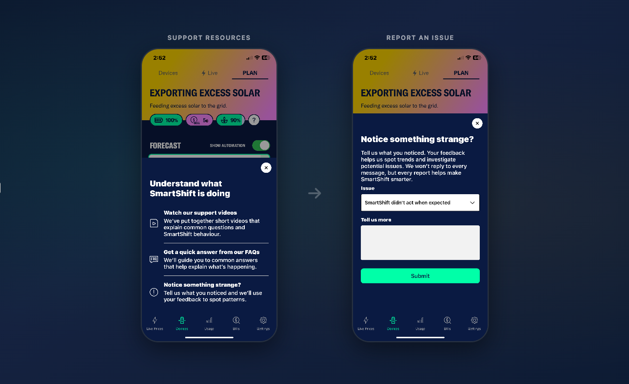If you're on SmartShift, you already know it's working away in the background - charging your battery when prices are cheap, discharging when they spike, and building a daily plan around your household's energy patterns. But sometimes, things might not look quite right. Maybe SmartShift charged your battery when you expected it to hold off. Maybe it didn't export when prices were through the roof. Or maybe something just felt... off. When that happens, we want to hear about it. And we've made it easy to tell us, right from the Amber app.