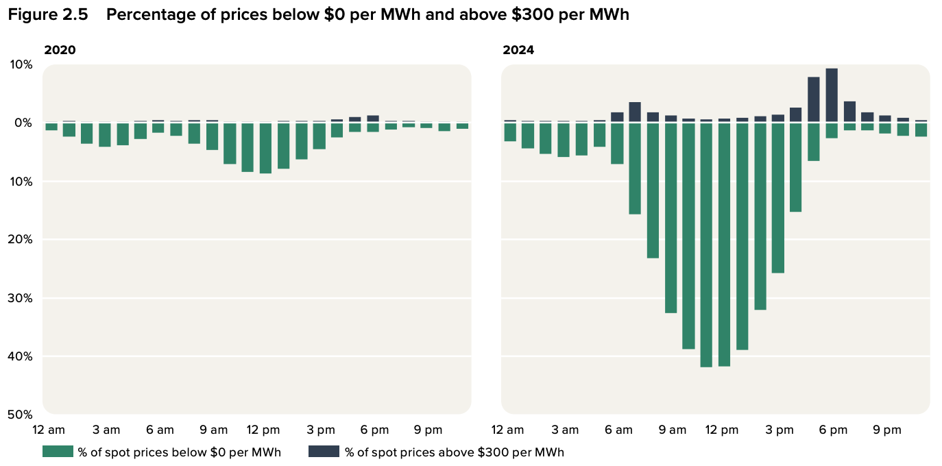 In 2024, 15% of all five-minute prices were negative (up from 3.5% in 2020). Between 11 am and 12 pm, prices were negative about 42% of the time. High prices above $300/MWh between 6 pm and 7 pm rose to almost 10%. Translation: the grid is swimming in cheap solar at lunchtime and under pressure in the early evening.